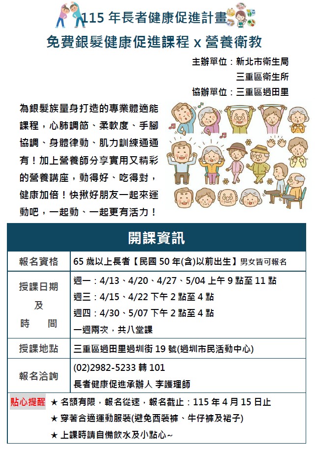 115年度長者健康促進班開始報名辦理(4月過田里)