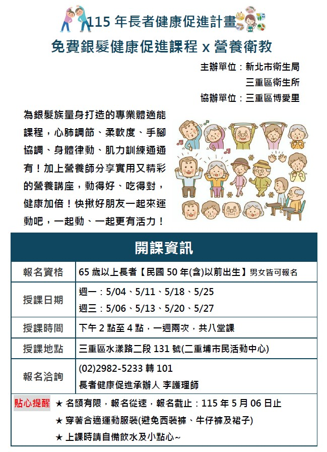 115年度長者健康促進班開始報名辦理(5月博愛里)
