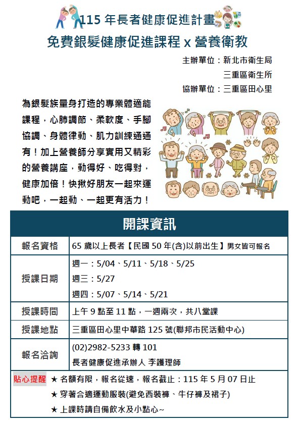115年度長者健康促進班開始報名辦理(5月田心里)